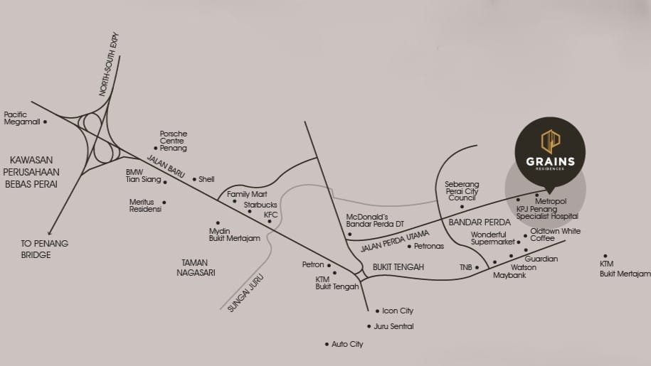 Grains Residences, a freehold serviced apartment in Bandar Perda, Bukit Mertajam, Penang, features 401 units and 14 commercial outlets across 45 storeys. With facilities like rooftop amenities and a seven-level parking podium, it is conveniently located near KPJ Penang Specialist Hospital, BM City Mall, and the upcoming Metropol, offering modern living with excellent accessibility.
